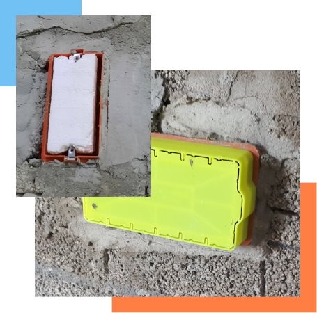 • לאחר שמתקינים על הקיר את קופסאות החשמל עם חוטי החשמל, מתקינים את מכסה הפטנט על הקופסא כך שבזמן התזת הטייח והצבע , לא יכנס בטון וצבע לקופסת החשמל.